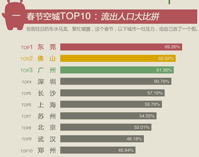 360大数据显示,春节期间经济发达地区的城市往往都是“空城”状态。北上广深四大一线城市都有超过一半的人返乡过节,依次分别为广州(61.36%)、深圳(60.76%)、上海(56.76%)和北京(52.01%)。