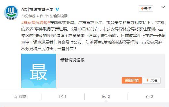 @深圳市城市管理局:在国家林业局、广东省林业厅、市公安局的指导和支持下,“绽放的多多”事件取得了新进展。2月13日18时许,市公安局森林分局将家住深圳市宝安区的“绽放的多多”微博主林某某带回归案,接受调查。目前该案件正在进一步调查中,调查进展我们将会及时公布。对涉野生动物的违法犯罪行为,市公安局森林分局将严厉打击,一查到底!