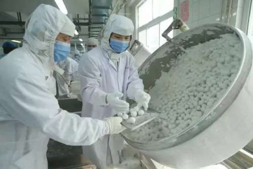 元宵生产车间的工人们正在抽查元宵大小是否均匀。中新社发 陈晓根 摄